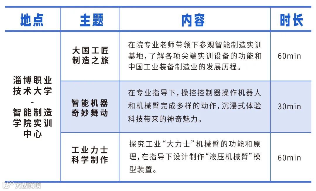 由淄博市科技馆联合市公共资源投资管理服务有限公司主办的“齐妙科学营”系列活动又上新啦!本次活动我们将一起走进淄博职业技术大学智能制造学院,参观淄博市装备制造职业启蒙和劳动教育基地、智能制造和现代制造实训中心,体验操控神奇的智能机器人和参与趣味的科学制作,看大国工业智造的崛起之路,感悟工匠精神!