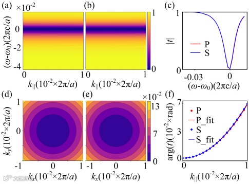 图3 Stampfli-Triangle光子晶体板透镜的传递函数:(a)-(b) 角度分辨透射率光谱 |tss(ω-ω0,k‖)| 及 |tpp(ω-ω0,k‖)| ; (c) 平面波矢模值 |k‖|=5 x 10-3 x 2π/α 时透射谱与频率的关系; (d)-(e) 工作频率ωop 下平面波矢域内透射相位分布 arg(tss(kx,ky))及arg(tpp(kx,ky)); (f) 工作频率ωop下Γ—Κ方向透射相位与平面波矢k‖的关系arg(t(k‖))及其二次拟合情况。