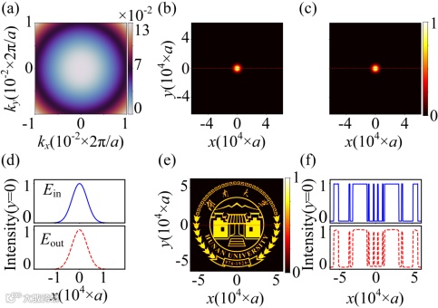 图4 倒易透镜数值演示: (a) 工作频率下平面波矢域内左旋圆偏振光透射相位arg(TLCP );(b) 输入高斯光束的空间光场轮廓;(c) 总输出场强(斯托克斯参数S0);(d) 输入场(上图)和输出场(下图)径向切片的归一化场强分布; (e)湖南大学校徽测试图像的输出场强分布;(f) 对应的径向切片的归一化场强分布。