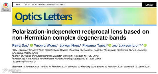 Peng Dai, Yihang Wang, Jiayun Ning, Pinghua Tang, and Jianjun Liu,“Polarization-independent reciprocal lens based on non-Hermitian complex degenerate bands,”Optics Letters51(6): 1630-1633 (2026).
