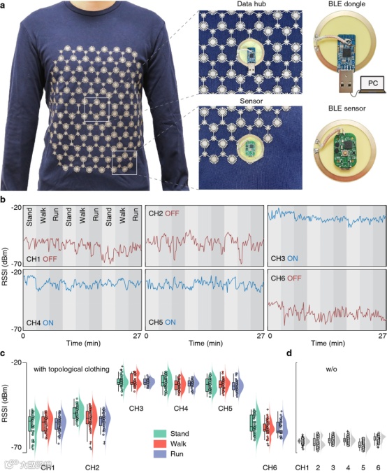 本研究使用导电布设计并制造了极薄的柔性拓扑衣服,突破了拓扑光子器件与人体集成时低柔韧性和高能量损失的物理限制,发展了一种高自由度、功能可重构人体传感网络的实现方法。实验上,该方法在人体上的信号传输增强了三个数量级;由拓扑衣服连接的多个生物传感器进行体征监测,在运动状态下实现了两个数量级以上的信噪比提升,检测精度提高了3倍。这项工作在拓扑物理与生物系统之间架起了桥梁,为将光子概念(如拓扑绝缘体和连续谱中的束缚态)引入并应用于生物医学奠定了基础。