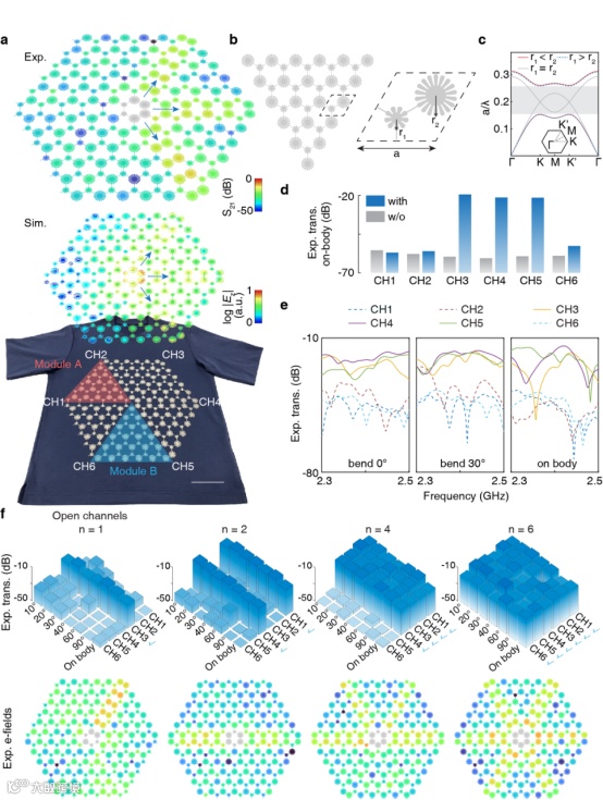 图2 拓扑超材料衣服的信号传输性能实验与验证。