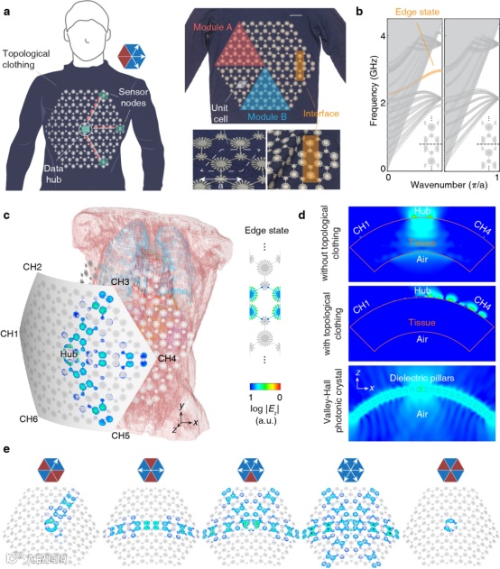 近日,Nature Electronics报道了一种柔性拓扑电磁超材料与功能性服饰、可穿戴系统相结合的全新研究工作。该工作发展了一种由导电布制成的二维拓扑模块,突破了传统拓扑光子器件因低柔韧性、高弯曲损耗而难以与生物系统集成的问题,提出了基于拓扑相变的可重构人体传感网络,在运动场景下实现了稳定、低功耗、可重构的体域通信与多传感器协同感知。相关成果以“Body sensor networks based on flexible topological clothing”为题发表于Nature Electronics期刊。