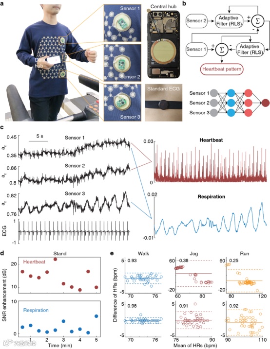 图4 基于拓扑超材料的可穿戴系统在运动状态下的体征监测(心跳、呼吸)。