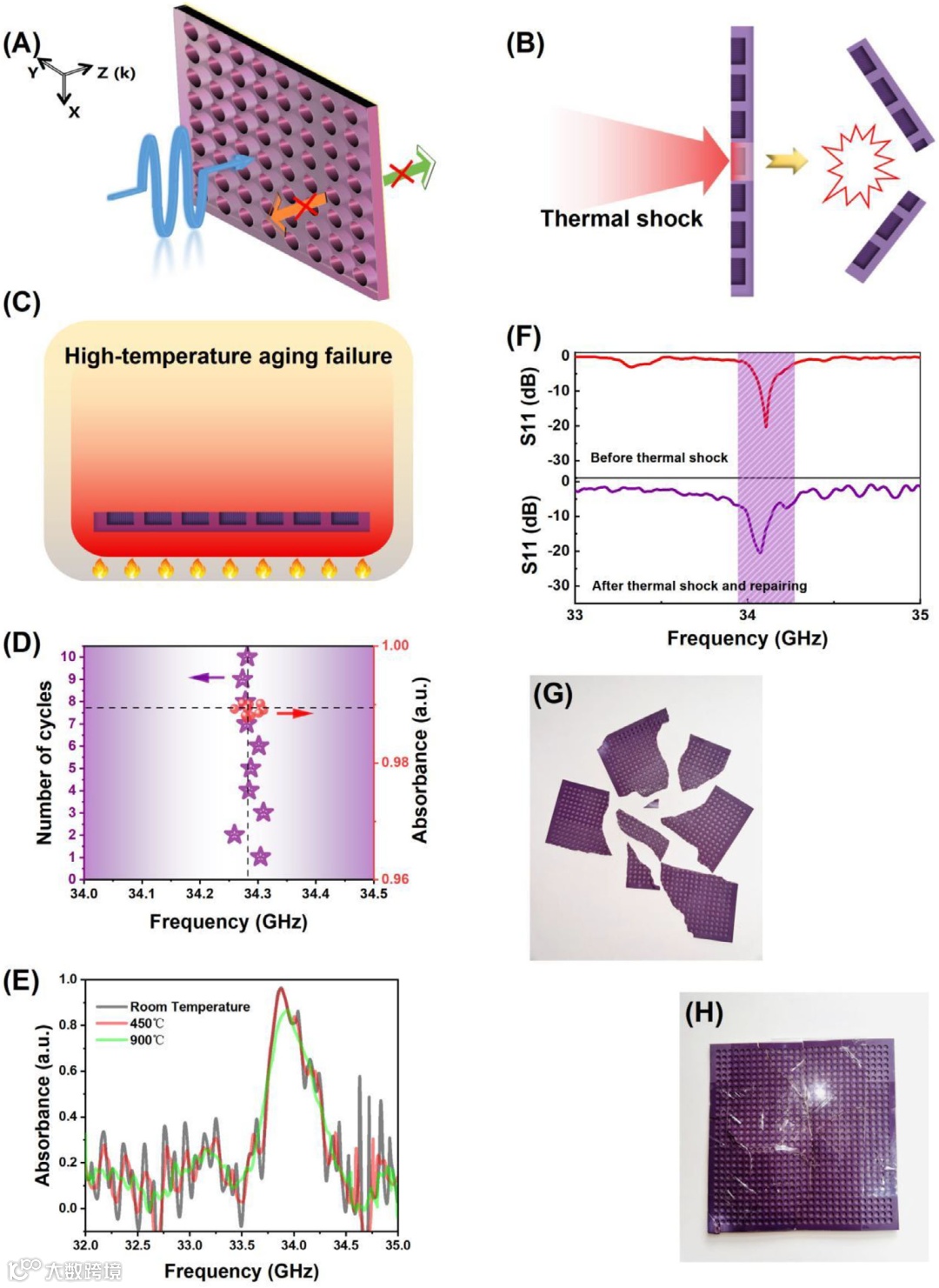 卓越的环境耐受性:全陶瓷自支撑结构无需基底。实验证明,该超材料在1300°C高温循环、热冲击后,即使经过修复,仍能保持稳定的电磁吸收性能,实现了“器件耐受温度等于材料耐受温度”。