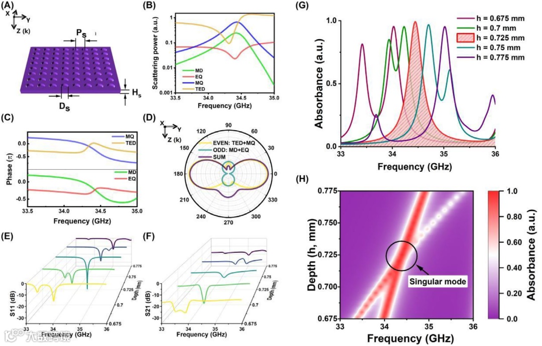 物理机制结合:将广义Kerker效应与连续体中的束缚态理论相结合。通过设计盲孔深度等参数,精确调控电偶极、磁偶极、电四极、磁四极等奇偶多极模式的激发与干涉,引导系统在特定频率点形成奇异点。