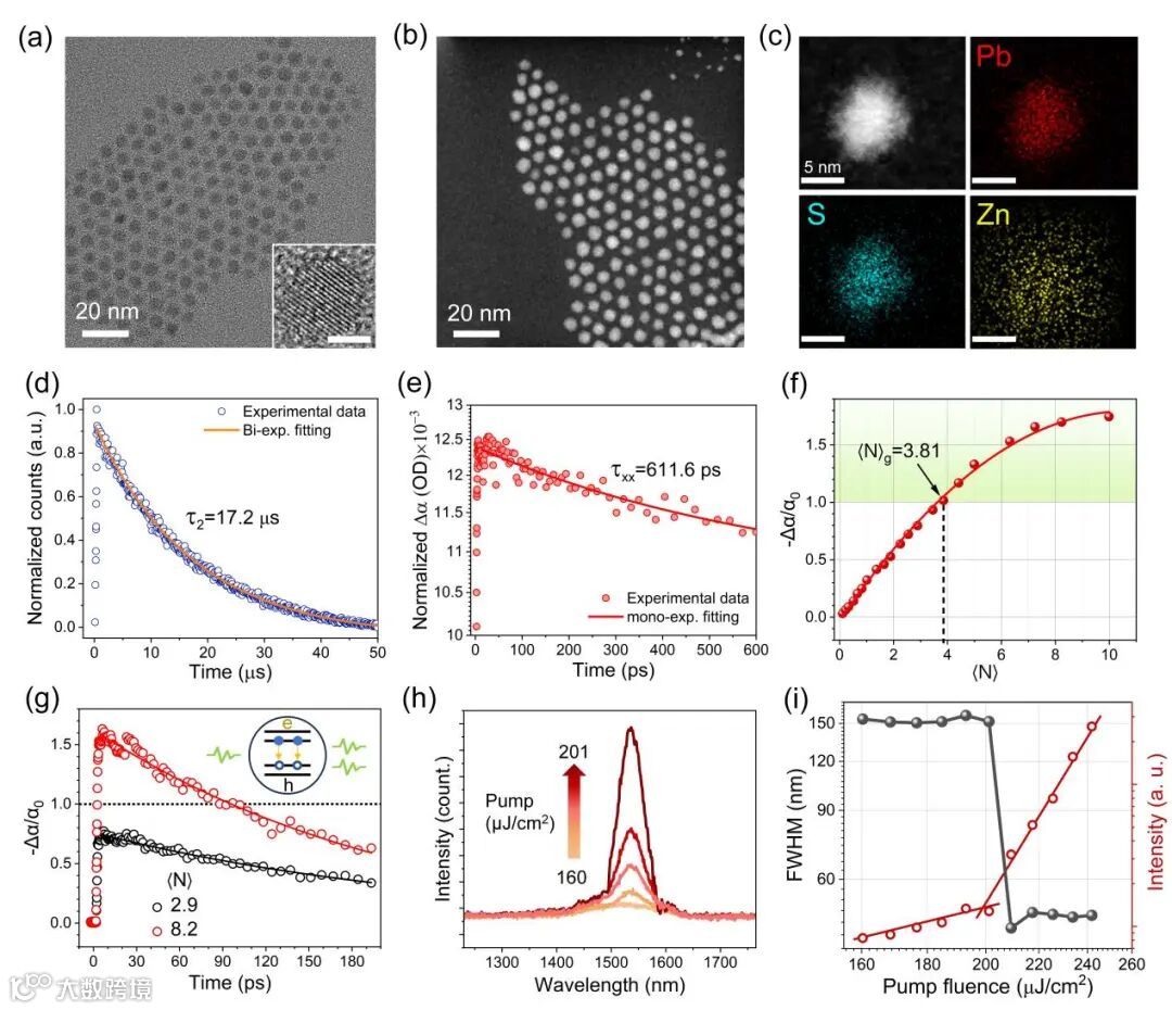 研究采用锌掺杂策略对PbS胶体量子点(CQDs)进行改性。透射电镜(TEM)与扫描透射电镜(STEM)图像显示量子点结晶良好,元素分布(EDS)证实锌元素主要分布在量子点周围,有效钝化了表面硫空位等缺陷态。表征结果表明,锌掺杂显著抑制了非辐射复合通道:量子点荧光寿命延长至17.2 μs,双激子寿命达611.6 ps,光学增益阈值降至3.81(平均每个量子点激子数),且增益寿命得到提升。在光泵浦下,量子点薄膜在~1550 nm处出现放大自发辐射(ASE),谱宽收窄至约46 nm,阈值约 200μJ cm⁻²,表明其具备优异的粒子数反转能力与增益特性。