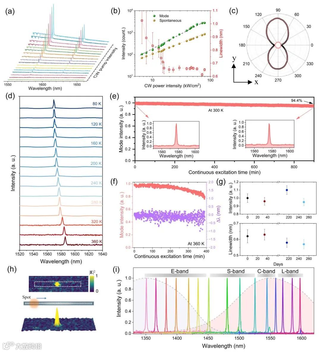 在1064 nm CW泵浦下,器件虽未显示激射所需的阈值突变,但产生了强烈的腔滤波自发辐射。在1350–1600 nm范围内观测到多个亚纳米线宽的谐振峰,其线宽小于1 nm,且偏振特性明显。该辐射表现出卓越的环境稳定性:在300 K下连续工作15小时,峰值功率衰减小于6%;在高达360 K的温度下仍能稳定工作;未经封装置于空气中储存250天后,性能几乎无衰减。通过调节纳米梁腔的周期参数,发射波长可灵活覆盖E、S、C、L四个通信波段,展现出其在片上多波长光源与通信领域的应用潜力。