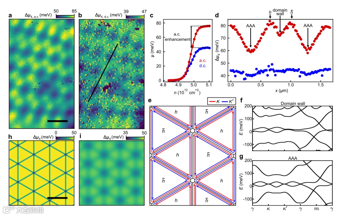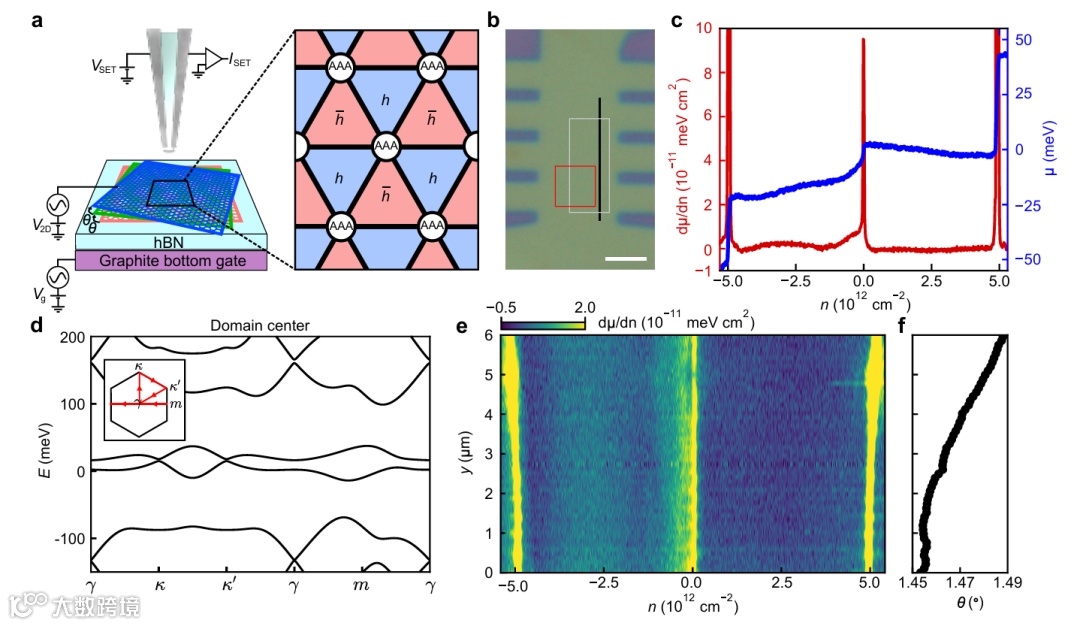 图 1:螺旋三层石墨烯(HTG)的电子结构与超莫尔畴