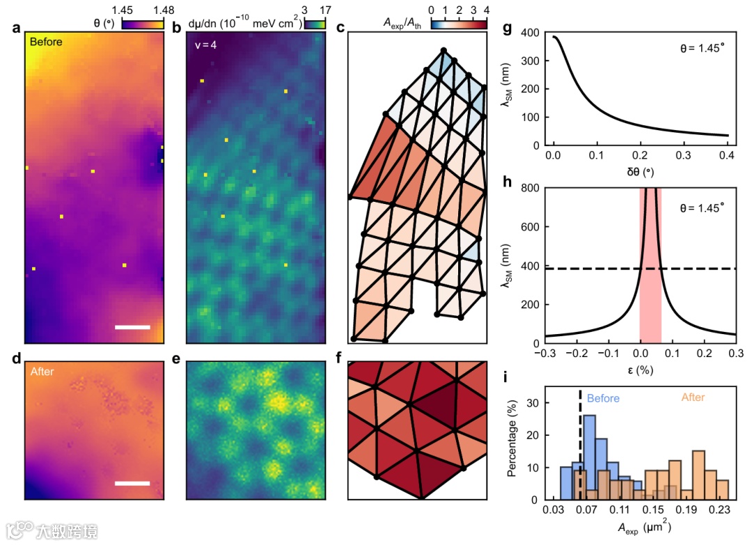 实验发现,晶格并没有保持理论上的准周期性,而是通过原子弛豫,自发重组成了巨大的、具有统一莫尔周期的三角形畴Domains。异质应变Heterostrain可以显著放大这个超莫尔晶格的尺寸(达到微米级),并在不改变畴内局部莫尔物理特性的前提下,重塑整个超晶格网络。还观测到了畴壁处电导率的增强,这与理论预测的拓扑边界态相符。