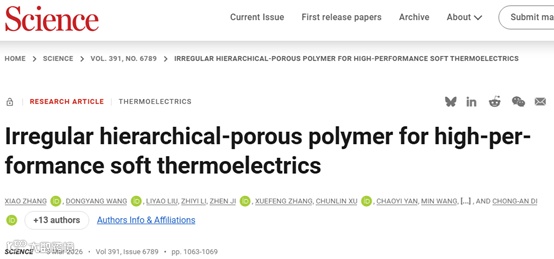 原文信息:Xiao Zhang et al., Irregular hierarchical-porous polymer for high-performance soft thermoelectrics. Science 391, 1063-1069 (2026).