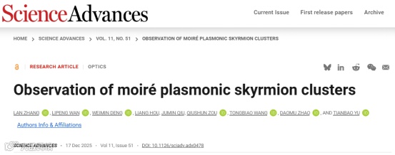 Lan Zhang, Lipeng Wan*, Weimin Deng*, Liang Hou, Jumin Qiu, Qiushun Zou, Tongbiao Wang, Daomu Zhao, Tianbao Yu*, Observation of moiré plasmonic skyrmion clusters. Science Advances 11, eadx0478 (2025).