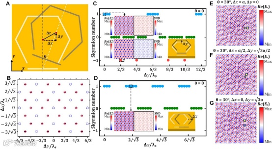 图3. 光学斯格明子对准信标。复合纳米结构的错位引起的光学斯格明子拓扑转变。