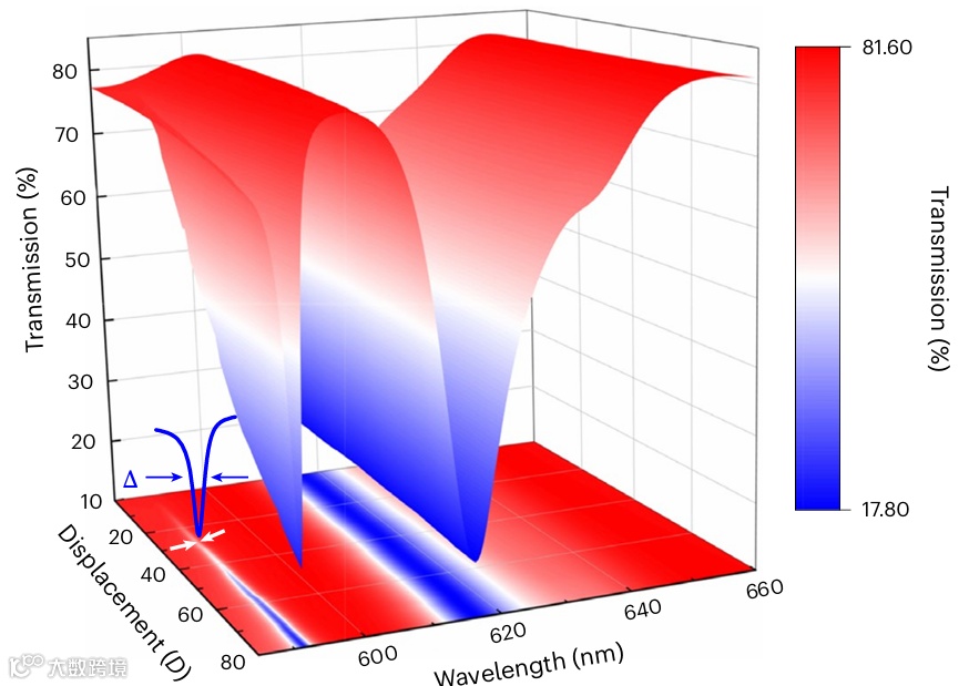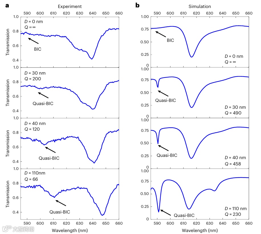 实验表明,随着面外不对称程度的增加,当位移从0纳米增加至110纳米时,系统谐振现象从无到有,品质因子从接近无穷大下降至66由大到小逐渐变化,为纳米级位置变化提供了灵敏的度量标准。连续域束缚态共振的有无及其品质因子数值,为实现芯片图案精密对准的关键工具。