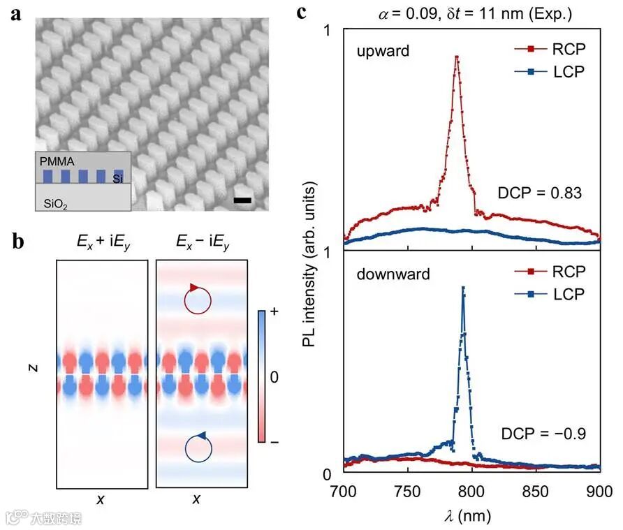 利用先进的纳米加工技术,团队在二氧化硅衬底上成功制备出垂直刻蚀的硅超表面(图2a)。在旋涂荧光染料并覆盖聚甲基丙烯酸甲酯(PMMA)以维持上下折射率对称后,他们实现了垂直圆偏振发光实验验证。结果与理论预测高度一致:向上发射右旋圆偏振光(DCP = 0.83),向下发射左旋圆偏振光(DCP = −0.9)(图2b、2c),充分验证了该机制的正确性。