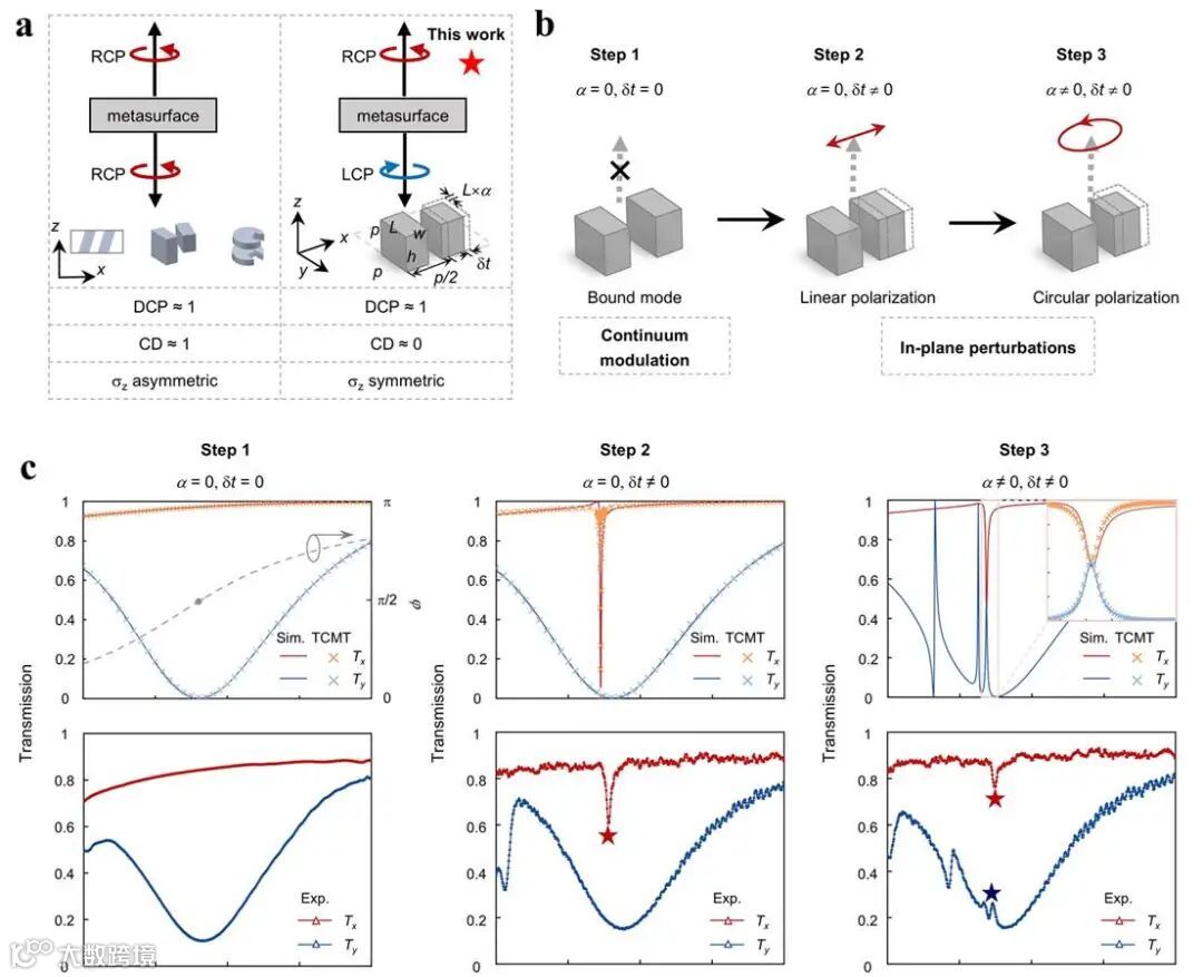 该研究团队基于时域耦合模理论(TCMT),构建了一个简明的物理模型,给出了优雅的解决方案。他们发现,如果将超表面视为一个光学系统,其中既包含共振模式(“演员”),也包含连续背景散射(“舞台”),那么这种背景会显著影响共振模式的辐射行为。传统研究多聚焦于共振本身,而他们揭示了:背景散射的各向异性会决定x 与y 偏振泄漏通道之间的相位差,唯有“各向异性连续体”才能实现所需的π/2 相位差。在此基础上,通过引入恰当的结构微扰(打破面内镜面对称性),进一步调节两通道的泄漏幅度,使其相等,从而实现圆偏振发光(图1b,1c)。