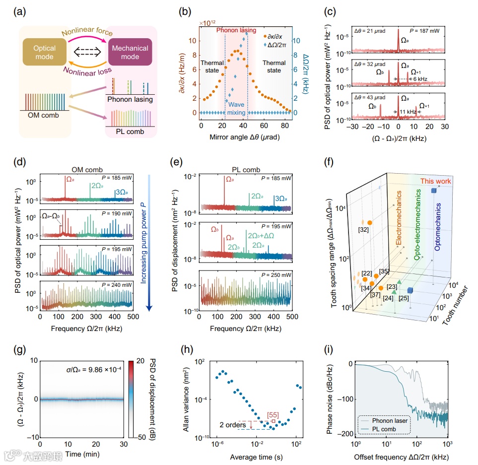 图 (i) 显示 PL comb 的相位噪声甚至低于单纯的声子激光态,证明级联四波混频过程具有自动相位匹配的稳相作用。