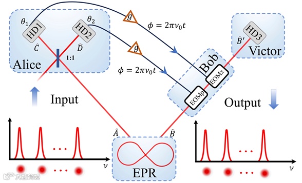 研究团队在连续变量量子纠缠辅助下,实验实现了多个边带模式的确定性量子隐形传态,即同时实现了多个量子态的量子隐形传输,实验原理如图所示。通过控制连续变量量子隐形传态中发送端的测量系统和经典信道的相位,同时实现基准边带频率奇数倍或偶数倍的多边带量子模式的连续变量量子隐形传态。进一步,通过改变经典信道的相位,实现了量子隐形传态边带量子模式数量的调控。