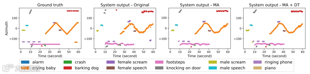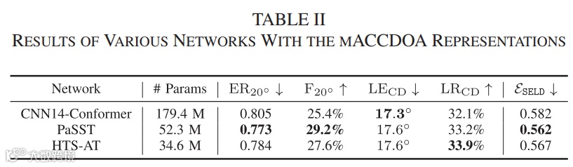公开数据集:在 L3DAS22 Task 2、DCASE 2021 Task 3、STARSS23 等公开数据集上,PSELDNets 经全参数微调后,在综合性能指标(ℰSELD)上均优于参赛系统报告的最佳单模型。经后处理(移动平均 + 动态阈值)后,单模型在 DCASE 2021 Task 3 上的 ℰSELD 与集成模型相当;