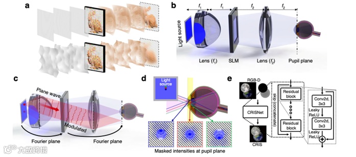 CRIS技术需将空间光调制器(SLM)置于光源傅里叶平面、瞳孔靠近SLM傅里叶平面;点光源在SLM处形成特定的平面波,经调制后在瞳孔平面被瞳孔孔径滤波,不同入射角度的光对应不同滤波后的波场,最终通过非相干叠加进行重建(如图1b);并通过图1e展示了用于实时合成全息图的CRISNet 神经网络结构(输入RGB-D图像、输出调制信号)。