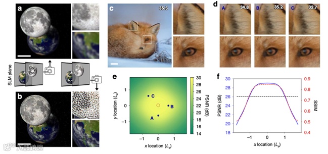 首先以“地球-月球”场景为例,通过数值重建,验证了CRIS的3D重建功能:对焦前景(月球)时地球模糊(图2a),对焦背景(地球)时月球模糊(图2b)。通过不同瞳孔位置的重建图像、PSNR随瞳孔位置的分布曲线(平均PSNR在瞳孔中心达29dB、位移至半视窗长度~2Lₑ时仍有26.3dB),验证了瞳孔移位下的强度不变性,且PSNR的半高全宽与理论推导的~2Lₑ一致,支撑了视窗扩展的理论依据。