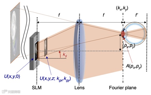 此外,团队还展示了CRIS技术移位不变性的理论推导示意图(如图4),通过标注瞳孔位置向量及对应的光学传播路径,直观呈现菲涅尔近似下瞳孔沿x、y轴位移时,特定入射角的光经瞳孔过滤后,其波场与瞳孔在中心时的波场通过非相干叠加可抵消差异,最终使视网膜处重建强度保持不变,为移位不变性公式推导提供可视化支撑。