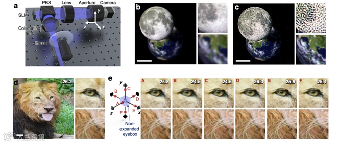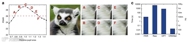 在实用性方面,团队通过图5a展示了基于DIV2K验证数据集的平均PSNR随相对瞳孔面积变化的曲线(红色虚线为相对于最大PSNR的-3dB线),明确瞳孔面积变化对重建画质的影响程度;并通过图5b呈现了不同相对瞳孔面积下的CRIS数值重建结果,未观察到类散斑图案,可见画质稳定性较强。