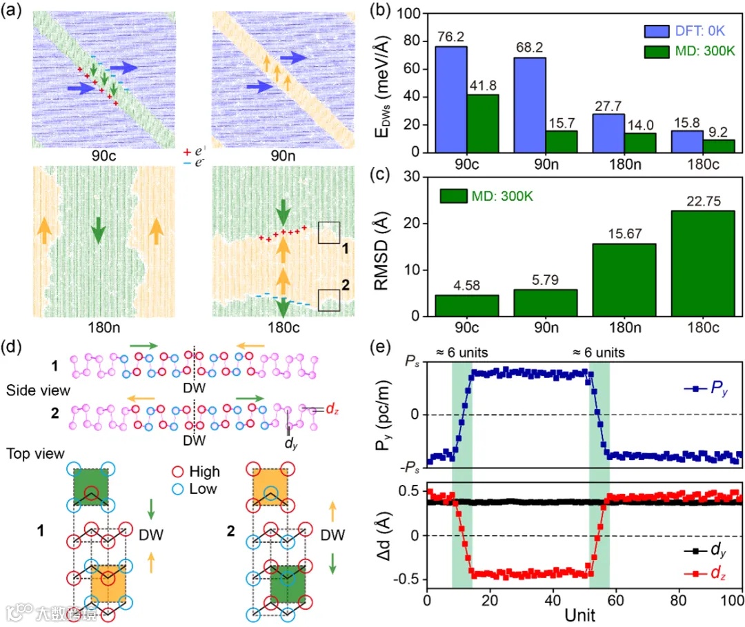 针对上述问题,西安交通大学材料学院强度室邓俊楷教授与澳大利亚墨尔本大学刘哲教授合作,通过深度势能分子动力学(DeePMD)模拟,在单质Bi烯二维材料中首次发现了一种由“畴对”交织构成的新型铁电拓扑畴结构,并进一步探究了其在机械载荷下的拓扑鲁棒性和畴界演化行为。首先,研究团队通过精确调控模拟条件,探索了有限温度下四种典型畴界(带电/中性90°与180°畴界)的热力学与动力学特征(图1),并揭示了180°带电畴界独特的Shuffle型极化翻转机制(90°畴界为传统的成键-断键机制)。