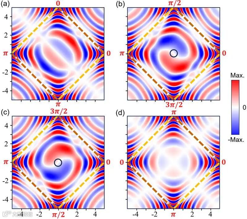 高阶双曲波的提出不仅仅是理论上的突破,更带来了全新的波前调控维度。研究团队展示了通过调节物理空间中4个面外线电流源的初始相位分布,可以生成多种形式的干涉场(如图3所示):
