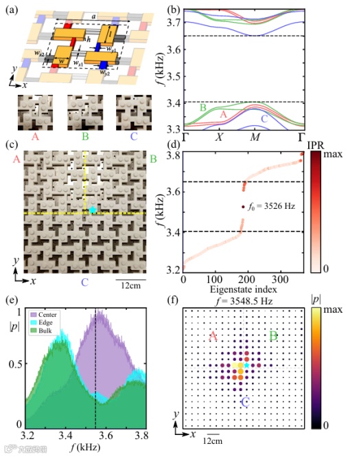 图3:嵌入式拓扑在二维声子晶体的观测。(a) 声子晶体的三种平庸原胞示意图与其体能带 (b)。(c) 声子晶体的实验图,中心为三边交界。(d) 频率特征值的分布。(e) 三边交界中心、一维边界与体态传输谱,其中声源能在三边交界激发出高度局域的拓扑态 (f)。