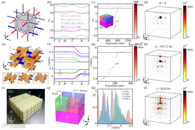 图4:嵌入式拓扑在三维声子晶体的观测。(a)-(b) 三维紧束缚模型与体能带。(c)-(d) 通过形成四边交界,高度局域的嵌入式拓扑边界态出现于零能。(e)-(h) 声学原胞示意图及体能带,接着仿真中确定零维拓扑边界态的存在。(i) 声子晶体实验图,其中四边交界位于样品中心。(j) 实验中声源与探针的位置,对应相关传输谱 (k)。中心探测的峰值频率区间与仿真 (g) 吻合,相应拓扑态在实空间的激发也高度局域于四边交界 (l)。