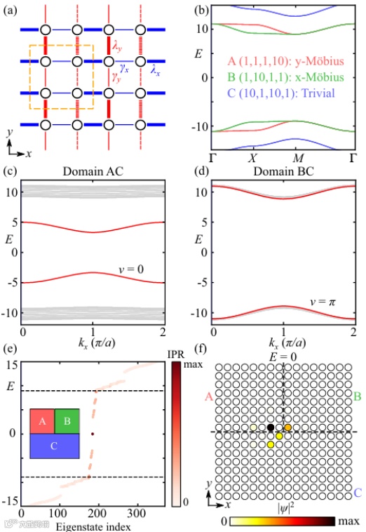 图2:投影晶体对称性之下的嵌入式拓扑。(a) 二维紧束缚模型,基于正负相间的耦合(实线与虚线),形成x方向的投影镜像对称(projective mirror symmetry)。(b) 二维平庸绝缘体 A、B、C的体能带。(c)-(d) 成对连接二维绝缘体之下的一维边界色散图,其中红色能带表示局域于一维界面的能带与相应的拓扑数 Zak 相位。(e) 三边交界的色散图,其中零能模局域在三边交界的中心 (f)。