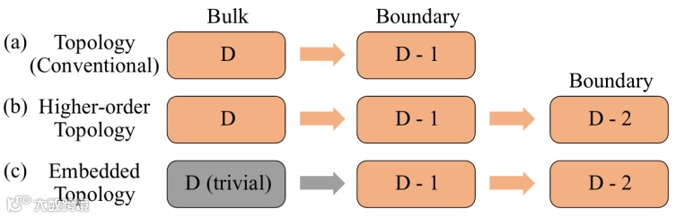 图1:不同拓扑机制中体边对应的作用链。(a) 常规拓扑绝缘体(一阶拓扑)起源于D-维拓扑体态,体现(D-1)-维的边界态。(b) 高阶拓扑绝缘体同样发源于D-维拓扑体态,在(D-2)-维乃至更低维度引发边界态。(c) 嵌入式拓扑绝缘体可以起源于D-维平庸拓扑的体态。非平庸拓扑可以透过(D-1)-维边界作为开端,引发(D-2)-维的拓扑边界态。