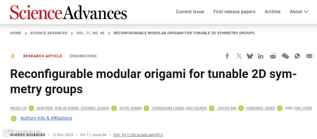 Weiqi Liu#, Qun Ren#, Yunjie Wang, Zhuang Zhang, Xiuyu Wang, Yongshan Liang, Hao Huang, Jiayao Ma, Hanqing Jiang*, Yan Chen*. Reconfigurable modular origami for tunable 2D symmetry groups, Science Advances, 2025, 11, eady3812.