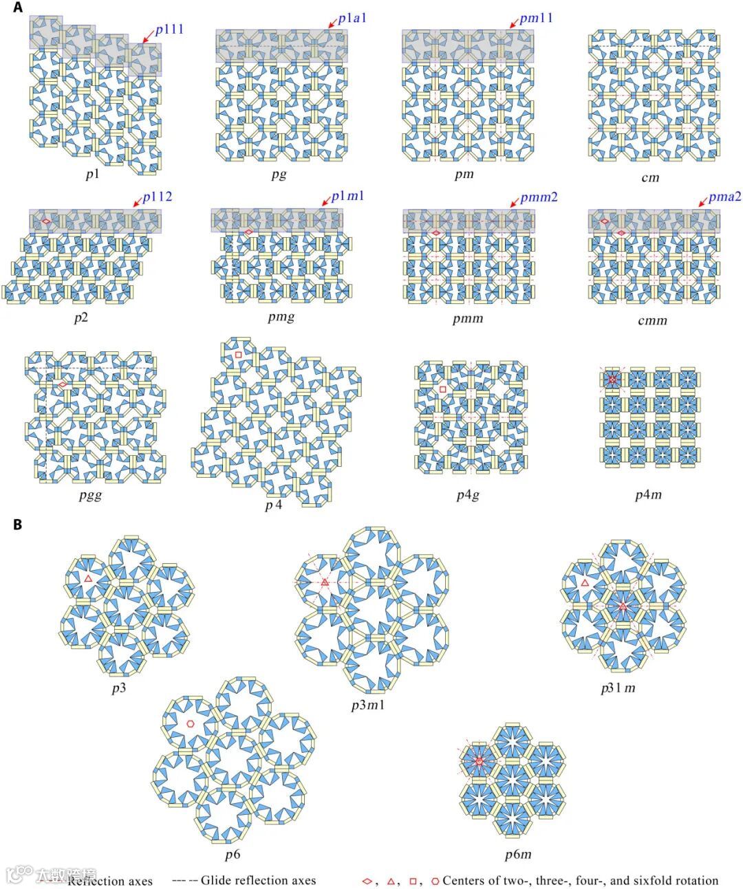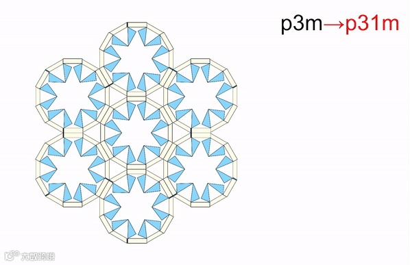 随后,研究团队开始用四单元模块按照统一的连接规则进行线性拼接生成条纹图案。例如,对 c1, c2 或 d1 点群模块施加平移操作,即可生成具有 p111,p112或 p1m1线群的条纹图。研究发现,通过重构每个模块的对称构型,单个条纹图案的整体对称模式就能呈现出全部7种线群(p111、p1a1、pm11、p1m1、p112、pma2 和 pmm2)。将这7种条纹图案在2D平面内平铺,就可以直接得到1重和2重旋转对称性相关的壁纸组。例如:将 p111、p112条纹图案直接堆叠,分别得到 p1、p2壁纸群;通过对 p1m1条纹图案进行滑移反射操作,即可得到 pmg壁纸群。4 重旋转对称性相关的壁纸组可通过对低对称性模块进行复合对称操作或直接使用高对称性模块平铺实现。例如,将 c2 点群的 4 单元模块进行四次旋转后双向平移,可生成 p4g 壁纸组;直接平铺d4点群的4 单元模块,即可得到p4m 壁纸组群。因此,只需要 4 单元模块的面内平铺就可以获得与1、2、4 重旋转对称相关的12 种壁纸组群(动图1)。而3 或 6 重旋转对称相关的壁纸组群(p3、p3m1、p31m、p6、p6m)则需要引入3 单元或 6 单元对称模块。例如,6 单元模块围绕中心模块形成蜂巢状结构,通过中心模块重构选择c3、d3、c6 或 d6点群,可实现 p3、p3m1、p6 或 p6m 壁纸组(动图2)。得益于模块的强大分岔重构能力,仅凭四单元和六单元模块这两套“基础乐高”,研究团队就从最基础的“零件”(10种晶体学点群),到中间的“条纹”(7种线群),再到壁纸组(17种空间群),最终构筑了整个二维对称宇宙的完整大厦。