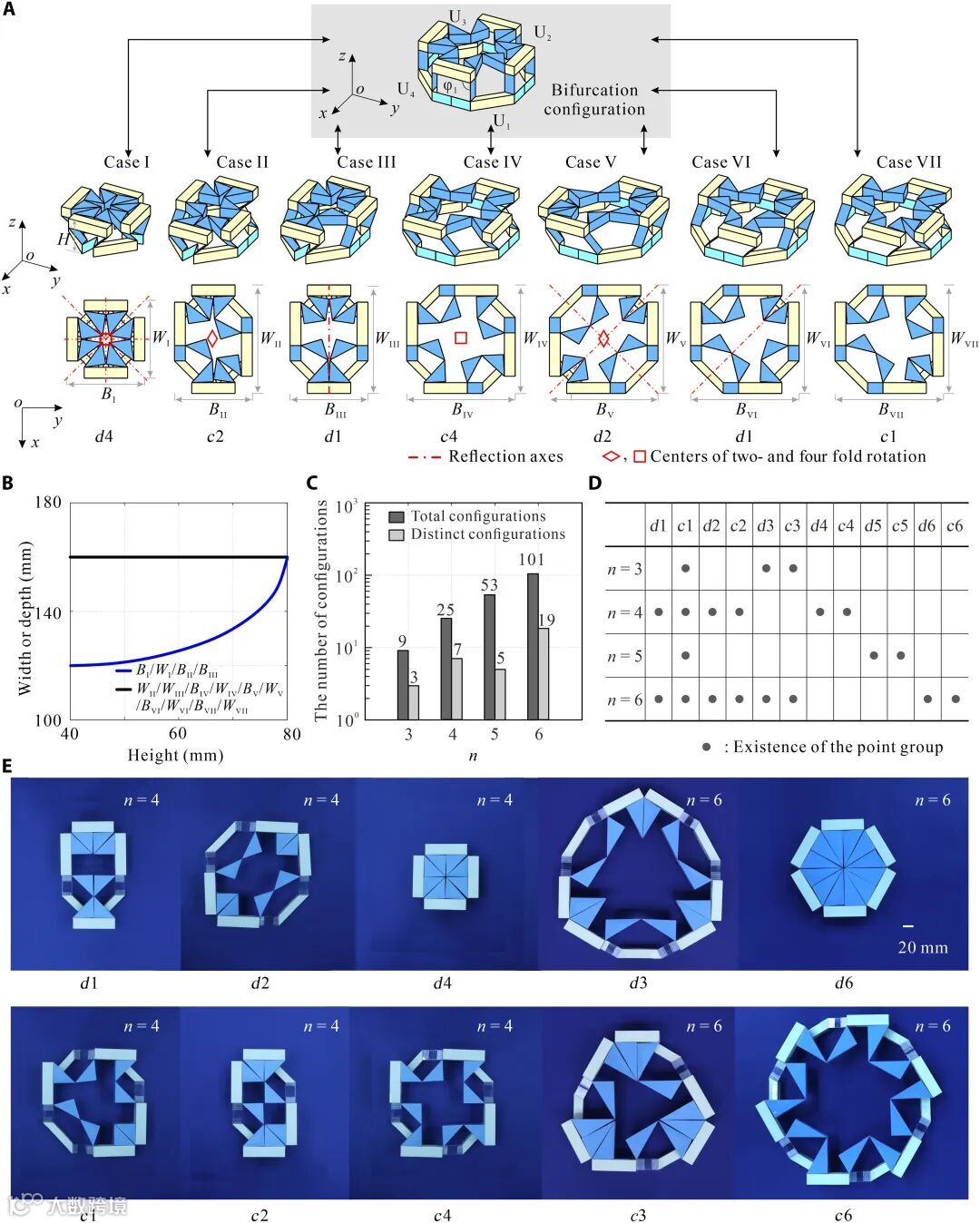 由于n 个单元构成的模块具有 n 重对称性,其单自由度特性和运动分岔得以保留。以四单元模块为例,在分岔点时,4个单元各自有2种路径选择,组合起来就像一个4位二进制密码,从而产生16种可能的运动模式。经过运动学筛选,最终获得了7种截然不同的对称构型,分别对应d4, c4, d2, c2, d1,和c1等点群(图2)。研究团队还分析了 3、5 和 6 单元对称模块的运动分岔和对称性变化:3 单元模块覆盖d3、c3、c1 点群;5 单元模块覆盖d5、c5、c1 点群;6 单元模块覆盖d6、c6、d3、c3、d2、c2、d1、c1 点群。由此可见通过将 n 个单元沿 z 轴圆周排列,可得到任意 dn 或 cn 点群的 n 单元对称模块。其中,四单元模块擅长生成与2重、4重相关的对称,而六单元模块则能产生3重和6重相关的对称。两者结合,便完整覆盖了全部10种晶体学点群:d1、d2、d3、d4、d6、c1、c2、c3、c4、c6。