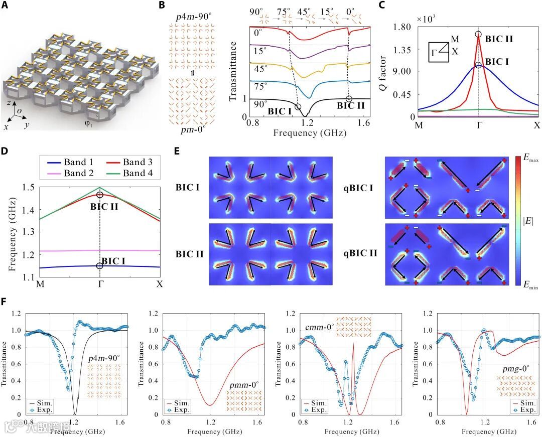 为了展示这种可调对称性结构的应用潜力,团队将金属天线阵列集成在可重构折纸基底上,制成智能“电磁超表面”,并在0.8–1.6 GHz 范围内进行了电磁仿真,从而揭示了对称保护的连续域束缚态向准束缚态的演化机制。研究发现,在高对称态 p4m-90° 构型下,共振模态的对称性与自由空间辐射通道不匹配,辐射被完全抑制,能量严格束缚于结构内部,形成对称保护型连续域束缚态(BIC),表现出理论上无限大的品质因子 Q。当逐步调节折纸单元的二面角 φ1(从 90° 下降至 0°)时,对称性依次降低为 pm-75°、45°、15°、0° 等状态。在此过程中旋转对称性被打破,仅保留镜面反射。这种保护性选择规则被解除,原本被禁锢的模式开始弱耦合至辐射场,演化为准束缚态(qBIC)。仿真结果表明,原先位于约 1.15 GHz 与 1.50 GHz 的两组 BIC 模式(Q 因子分别为 1628 与 1032)转化为可辐射的 qBIC I 与 qBIC II,对应透射谱中典型的非对称共振谷。电场分布分析进一步揭示了这种转变的内在机制,在 p4m-90° 状态下,电场矢量在相邻单元间呈等幅反向分布,导致远场辐射相互抵消;而当结构对称性降至 pm-0° 时,干涉抵消条件被破坏,能量泄露至外场。研究还将分析拓展至 12 种不同对称群构型,结果表明:高对称结构(如 p4m、pmm)对应完全束缚的 BIC,仅在谱中出现单一、窄带共振峰;具有全局手性或局部镜面对称(如 p1、p2、p4、cm、cmm、p4g)的体系,可激发多频点窄带共振,显著增强场能局域化;引入滑移反射(如 pg、pmg、pgg、p4g)后,对称性进一步削弱,仅能形成部分束缚态,表现为宽而浅的共振谷。为验证理论预测,研究团队制备并表征了多种典型超表面样品。实验测得的透射谱与仿真结果在共振位置和趋势上高度一致,证明了qBIC 的对称性选择规律。