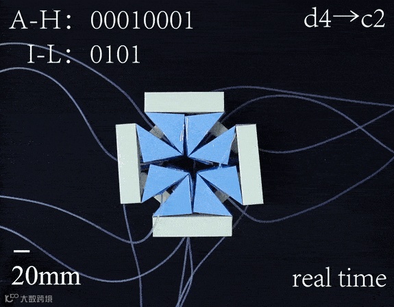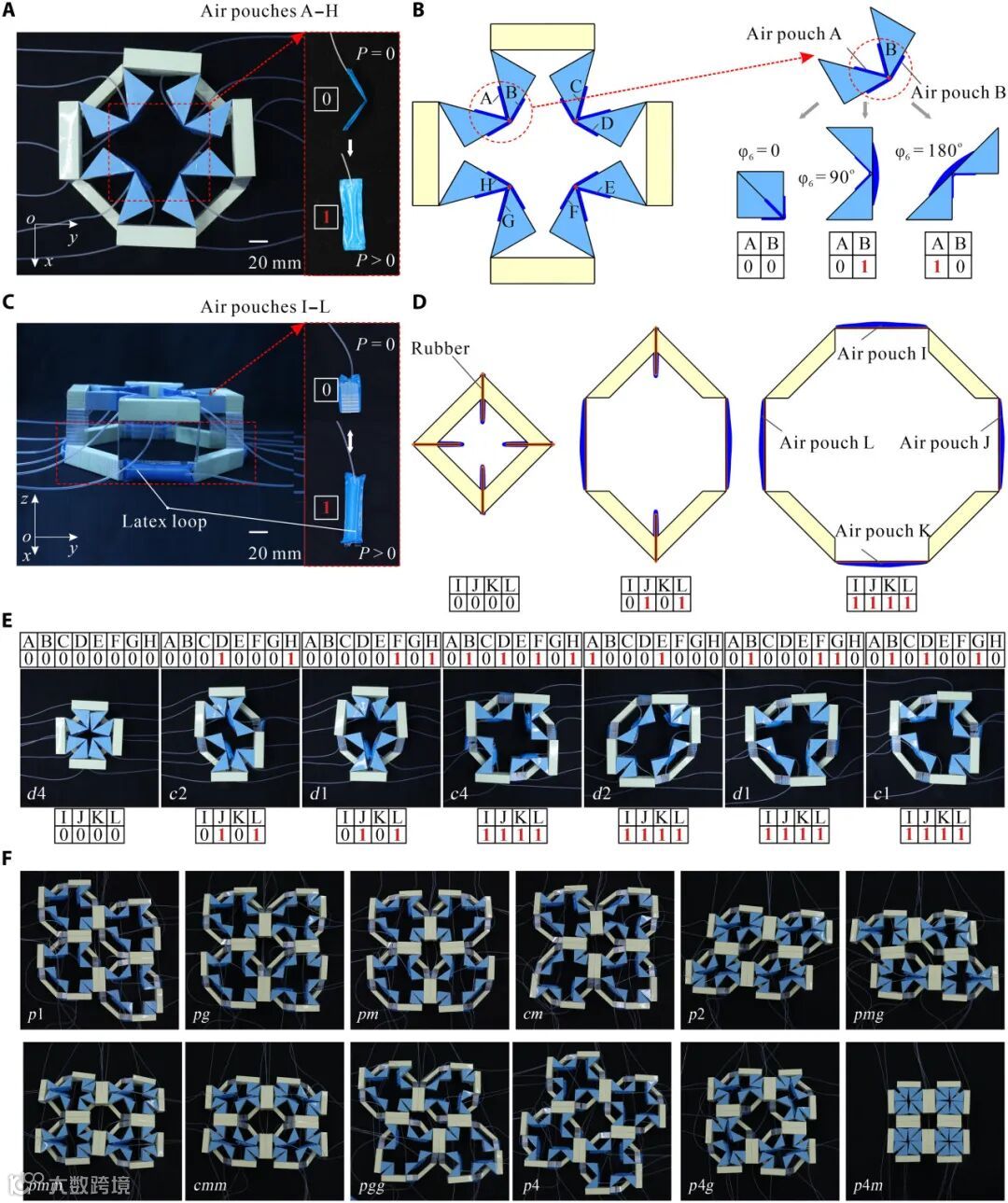 如此复杂的对称变化,控制起来会不会非常困难?答案出乎意料的简单。研究团队开发了一套双层气动控制系统(图3),通过向嵌入的气袋进行“二进制”充气(充气/不充气),即可精准控制模块的变形。上层“对称选择器”:由8个气袋组成,负责在分岔点“指挥”每个单元选择M1或M2路径,从而决定整体的对称类型。下层“展开驱动器”:由4个气袋与预拉伸乳胶圈构成的气腱耦合系统组成,负责控制整个模块的展开与收缩,改变其整体尺寸。通过给不同的气袋组合“发令”(如“00010001, 0101”),模块就能在几秒内从一种对称形态变换到另一种对称形态(动图3)。这种方法简单、可靠,且具有很强的容错性。更重要的是,这种基于二进制指令的分布式控制策略具有极佳的可扩展性。通过统一协调各模块的气动信号,该方案可直接推广至大尺度的镶嵌结构(动图4)。