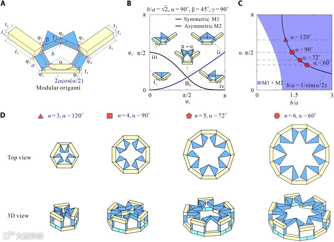 研究团队从模块化折纸中找到了对称性调控难题的破解之道。他们先设计了一种单自由度模块折纸单元,其运动学上等效于空间七杆机构(图1)。该单元具有一个关键特性:运动学分岔。当折纸单元运动到一个特定状态(分岔点,φ1=π/2)时,选择路径M1:模块的两个矩形面板反向摆动,模块保持平面对称。选择路径M2:两个矩形面板同向摆动,模块的对称性被打破。正是这个简单的“二选一”机制,为后续千变万化的对称模式埋下了伏笔。接着,研究团队像玩高级乐高一样,将多个单元(如3、4、5、6个)环形排列,组装成“n单元对称模块”。