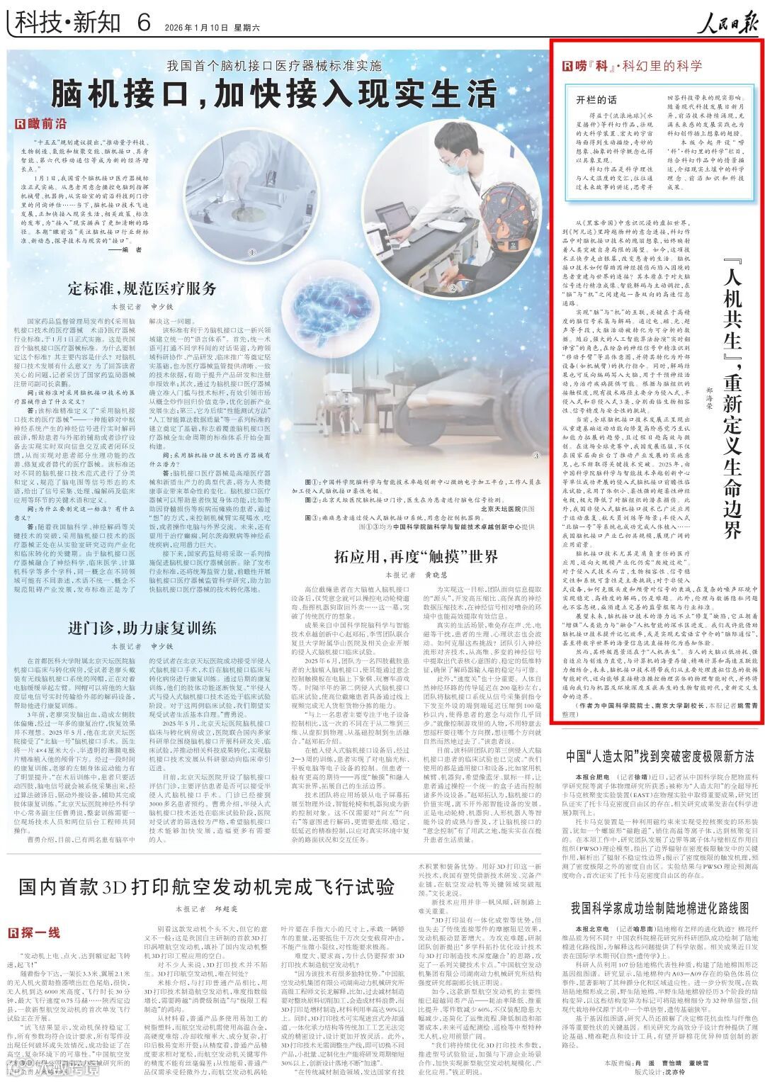 1月10日,《人民日报》刊登了南京大学党委常委、副校长、中国科学院院士郑海荣的署名文章《“人机共生”,重新定义生命边界》。以下为全文内容: