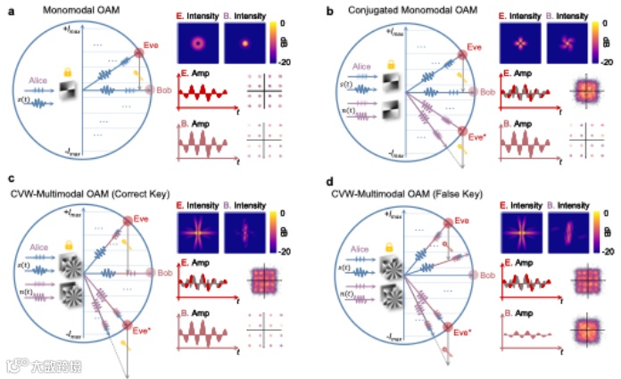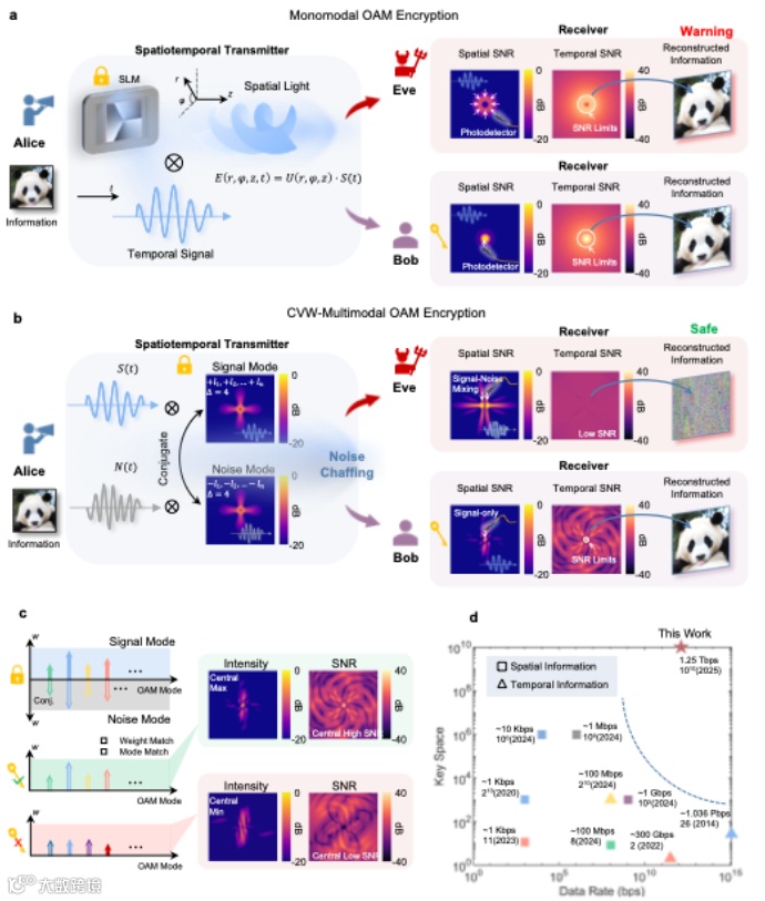 为了突破这些瓶颈,本研究团队从经典密码学“糠与麦(Chaffing & Winnowing)”理念中得到启发,将真实时间信号视作“麦粒”,将随机噪声视作“糠秕”,思考是否可以在光物理层复刻这一“真信号被噪声包裹”的高安全结构。通过利用共轭轨道角动量(OAM)模态的空间对称性,他们在时域与空域之间建立了新的加密通道,使时间域的高速信息得以被空间域的噪声充分掺混,从而有效隐藏高速星座图。这一思想的提出,为打破传统系统在“高速度”与“高安全”之间的长期权衡提供了关键契机。