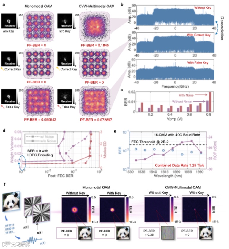 最终,在8波长WDM复用的高速相干通信链路中,团队通过加载CVW-多模态OAM结构,成功实现了总速率1.25 Tb/s的超高速安全光通信(图4e)。在正确密钥下,各波长信道均保持低误码率,而在无密钥或错误密钥情况下,所有星座图均呈随机化状态,证明了体系在高速传输、强安全性与高鲁棒性方面的全面优势。