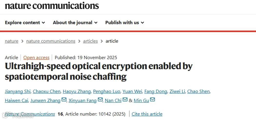 近日,复旦大学迟楠教授团队携手上海理工大学顾敏院士团队在光学物理层安全通信领域取得关键性突破。他们提出了一种全新的“时空噪声掺混(Spatiotemporal Noise Chaffing)”光学加密机制,实现了目前已知光学加密体系中最高的物理层加密速率——1.25 Tb/s(太比特每秒),同时将加密密钥空间扩展至10¹⁰维规模。这一成果不仅打破了传统光学加密受限于空间调制速度的技术瓶颈,也开启了高安全、高速率光通信融合的新方向。相关研究以“Ultrahigh-speed Optical Encryption Enabled by Spatiotemporal Noise Chaffing”为题发表于国际权威期刊《Nature Communications》,施剑阳副研究员与博士生陈超旭为共同第一作者,顾敏院士、迟楠教授、方心远研究员和张俊文教授担任论文的通讯作者。