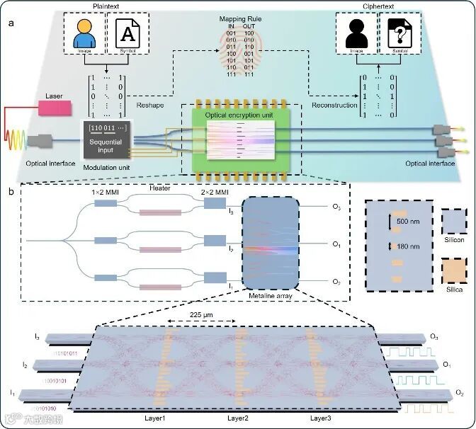 图1. 片上光学加/解密系统设计示意图。a) 片上光学加/解密系统整体结构示意。b) 构成光加密单元的级联衍射超构表面示意图。