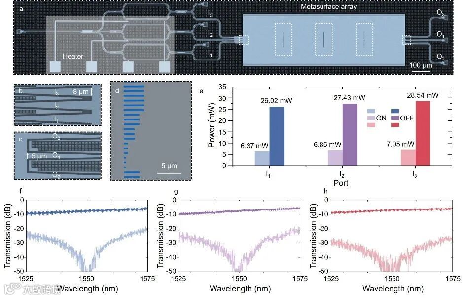 图3. 器件结构表征与热光开关性能测试。a)芯片的光学显微照片。b、c)输入、输出波导区域的局部放大显微照片。d) 超构表面阵列中slot结构的扫描电子显微照片。e) 三路热光开关测量的开关功率。f–h) 各开关状态下参考端口的传输光谱。