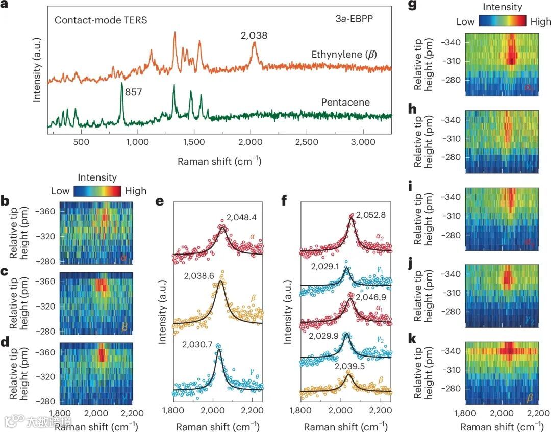 图3和图4共同聚焦于极化子超晶格中振动模式的表征,特别是通过TERS技术实现了化学键精度的空间分辨振动谱测量。图3展示了3a-EBPP和5a-EBPP中源于并五苯单元外围C-H键的面外振动模式(如~858 cm⁻¹),其拉曼峰位和峰宽在超晶格内不同位点表现出明显的调制,表明振动简并性被解除,这与结构畸变导致的对称性破缺直接相关。为了探测沿聚合物骨架的乙炔键的关键振动信息,研究采用了接触式TERS测量模式(图4)。图4a-c, g-k显示,当针尖接近样品至近接触高度时,在通常拉曼沉默的区域(~2000-2050 cm⁻¹)成功观测到了乙炔键的面内伸缩振动信号。对不同乙炔键位点(a, β, γ)的拉曼谱进行积分和洛伦兹拟合后(图4e,f),发现其振动频率在超晶格内存在周期性调制,且频率高低与根据AFM表征推测的键序(a>β>γ)相符,频率越高表明键级越强(更接近三键特征)。这种振动频率的调制直接反映了由电子-声子耦合(EPC)引起的Peierls畸变,即键长交替变化。同时,拉曼峰的半高宽(FWHM)也表现出约20-25 cm⁻¹的显著变化,远大于C-H振动的3-5 cm⁻¹,定量揭示了沿聚合物骨架的EPC强度远高于侧基团,突出了骨架振动在极化子形成中的核心作用。