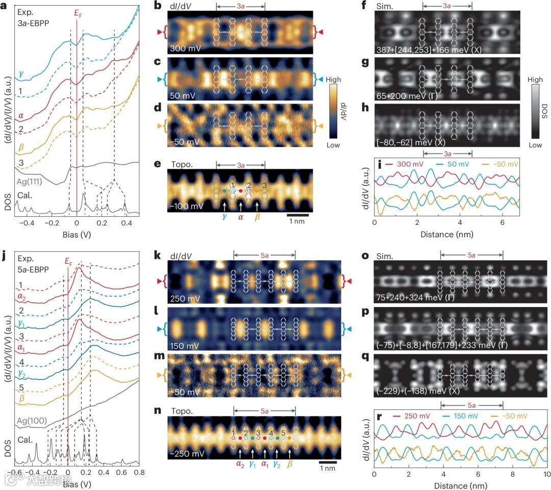 图2通过空间分辨的dI/dV谱和态密度(DOS)映射,深入揭示了3a-EBPP和5a-EBPP极化子超晶格中的电子态特性及其电荷密度波(CDW)序特征。在宽能量范围内测量的dI/dV谱显示出强烈的位点依赖性,并且在费米能级(E_F)附近观察到一个小的能隙开口,这是CDW体系的典型特征。dI/dV映射在占据态和未占据态能量下均展示了电子密度的周期性空间分布,这些分布与计算得到的布里渊区高对称点(Γ或X点)的轨道态密度高度吻合。特别值得注意的是,在围绕E_F的特定能量下(如3a-EBPP在±50 mV,5a-EBPP在-50 mV和+150 mV),dI/dV映射显示出清晰的反相位调制特性,如配对的线剖面图所示,这是CDW序的直接实空间证据。这种反相位调制不仅出现在E_F附近,也出现在E_F之上多个能量处,表明极化子超晶格中存在多能带CDW序,这源于极化子能带结构中多个子带在费米能级附近的能隙opening。该发现超越了传统一维体系中单一CDW的认知,揭示了相互作用极化子导致的复杂多体效应。此外,在-50 mV下,极化子态密度主要局域在超晶格单元内特定数量的乙炔键位点,这与每个超晶格单元内估计的电子数目相符,支持了单极化子(而非双极化子)的图像。