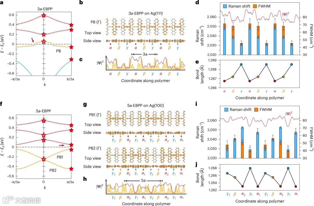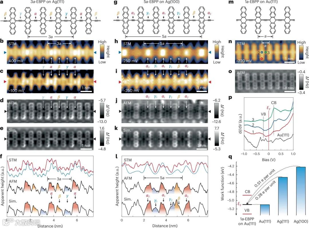 图1系统展示了在不同金属衬底(Ag(111), Ag(100), Au(111))上合成的EBPP聚合物的结构表征结果,直接揭示了掺杂诱导的极化子超晶格的形成。在Ag(111)和Ag(100)上生长的EBPP(分别称为3a-EBPP和5a-EBPP)的高分辨率STM和nc-AFM图像中,清晰呈现出三倍和五倍于原始晶格周期(a)的超晶格结构,这种周期性调制源于乙炔键(-C≡C-)桥连键的键序变化,并通过AFM线剖面中的表观高度差异(标记为a, β, γ)得以量化。与此形成鲜明对比的是,在Au(111)上生长的1a-EBPP则表现出均匀的1a周期结构,没有明显的超晶格调制,这表明超晶格的形成并非本征性质,而是与衬底相关的电子掺杂直接相关。通过X射线光电子能谱(XPS)和Bader电荷分析证实,银衬底(尤其是Ag(100))向聚合物链的电荷转移显著高于金衬底,不同的掺杂水平导致了超晶格周期性的差异(3avs 5a)。图1p中1a-EBPP的dI/dV谱显示其具有0.44 eV的半导体带隙,且能带相对于费米能级近乎对称,进一步支持了Au(111)上电荷转移可忽略不计的结论。这些结果共同表明,观察到的超晶格是银衬底n型掺杂诱导电子极化子周期性排列的结果,即形成了准一维极化子超晶格。