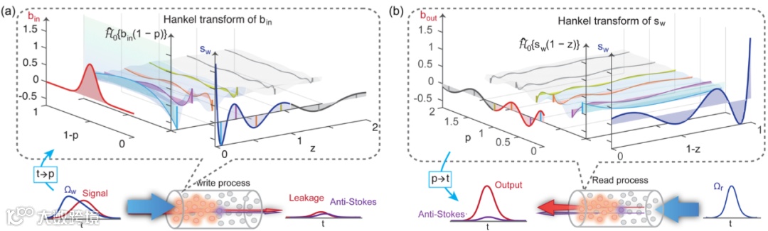 图1 | 拉曼量子存储器中的汉克尔时空变换映射关系。(a)写入过程中生成的自旋波空间分布是输入光场的汉克尔谱。(b)读出过程中输出光场的时间波形是自旋波的汉克尔谱。