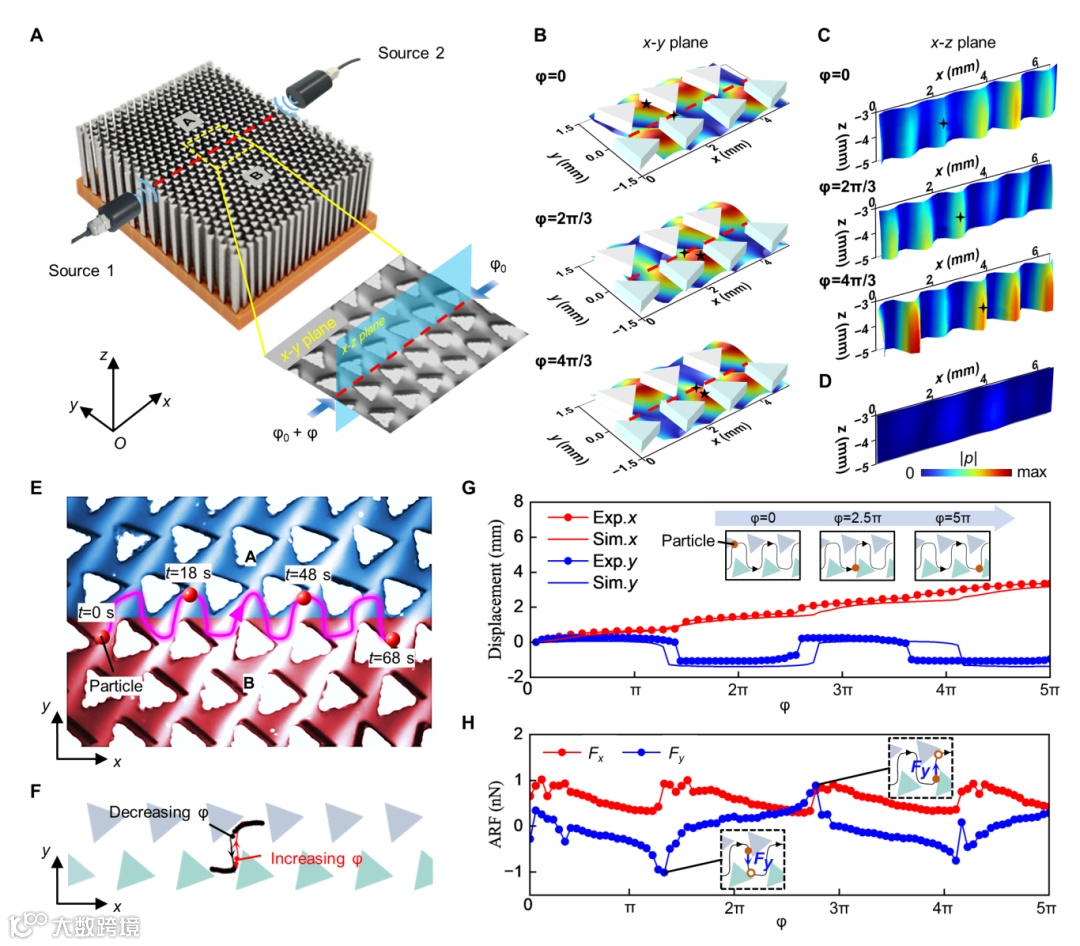 图2: 直线型拓扑波导中的驻波与质量输运。(A) 实验样品及驻波激励示意图。插图标明了晶格A-B界面(x-z平面)与颗粒操控观测平面(x-y平面),红色虚线标示x-y平面中晶格A与B的分界处。(B) 和 (C) 不同相位差条件下x-y平面的模拟声压场与x-z平面的实测声压场。其中z轴原点位于柱体上表面。(D) 距A-B界面四个晶格常数距离处的x-z平面声压场分布。(E) PDMS颗粒在拓扑通道中的输运。(F) 相位差φ递增与递减时颗粒往返仿真运动轨迹。(G) 颗粒位移随φ的变化关系。插图标注了φ=0,2.5π,5π时的颗粒位置(从左至右)。(H) x与y方向声辐射力随φ的变化关系。插图标注当Fy达到峰值时颗粒的位置(实心圆)及下一时刻位置(空心圆)
